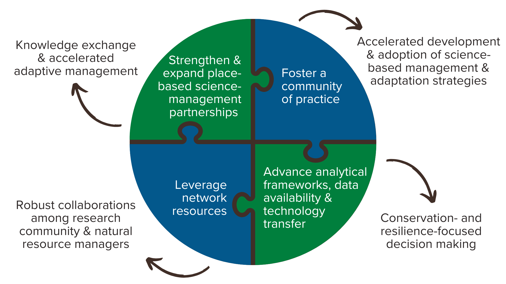 In response to the growing sense of urgency to address natural hazards in both natural and human systems, the development of adaptation science and implementation of strategies have triggered advances in science and innovation and sparked myriad responses from federal, Tribal, state, and local governments, as well as nonprofit organizations. However, challenges remain in coordinating across sectors, organizations, and landscapes to harness collective innovation and operationalize adaptation strategies at broader scales.